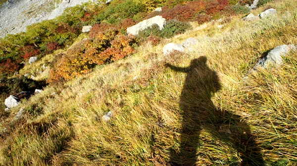 30分ほど寝込んだ後、結局は当初の目的であった朝陽に燃える天狗池の紅葉を眺めながら槍を目指す