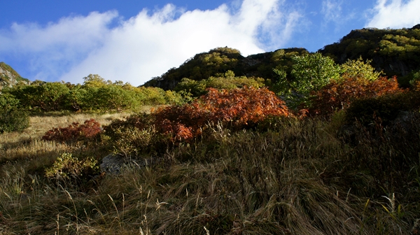 と、トラバースを始めたが、ハイマツが途切れたかと思うと突然山ヌケだ