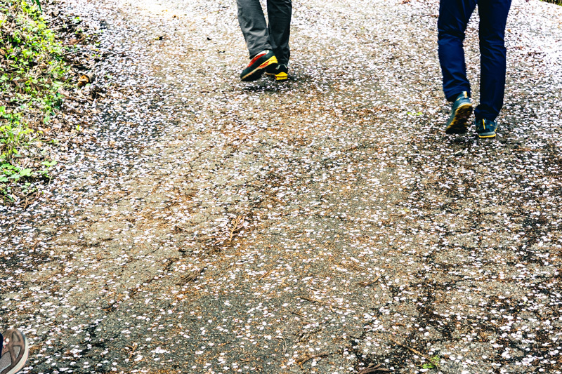 樹林から林道へ抜け出すと、もう地面は山桜の花吹雪