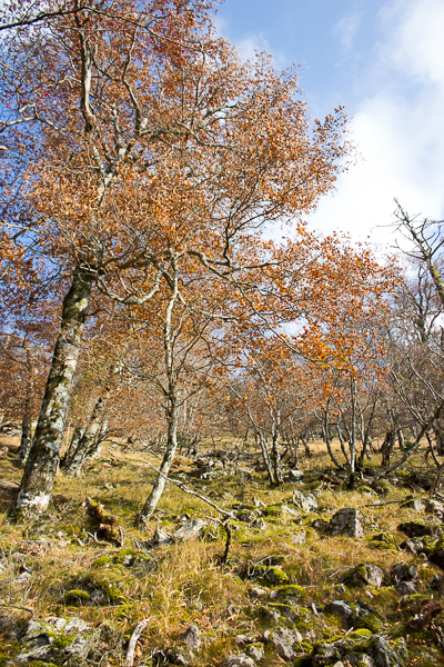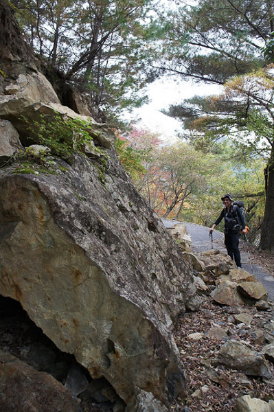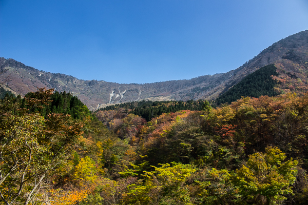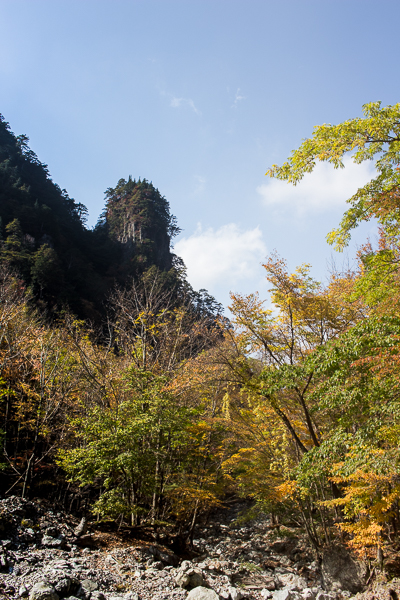 岩石の群れにしがみ付きながら進むと、谷の両脇には燃える紅葉が現れ