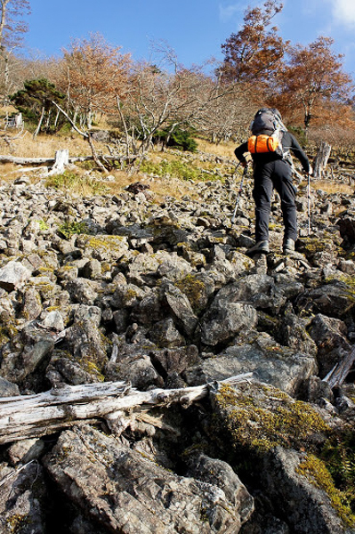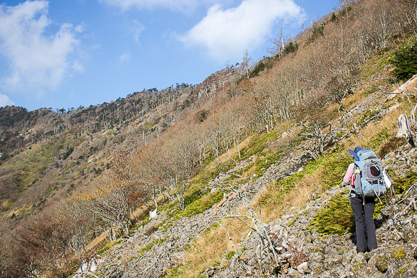 ゴーロ帯の岩を頼り、樹に掴まり、急登を詰めること50分