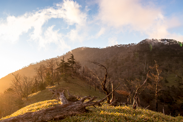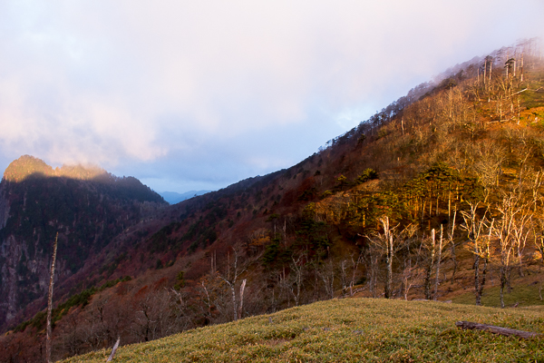 朝焼けを期待して奥駈に上がるが、風は相変わらず強く雲も居座っている
