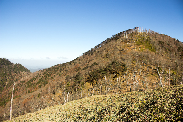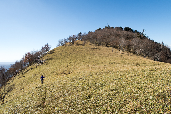 そこだけ笹原に覆われて、南方に釈迦ヶ岳を望む