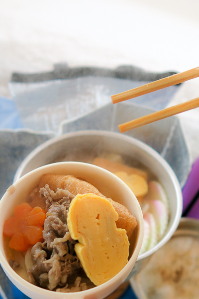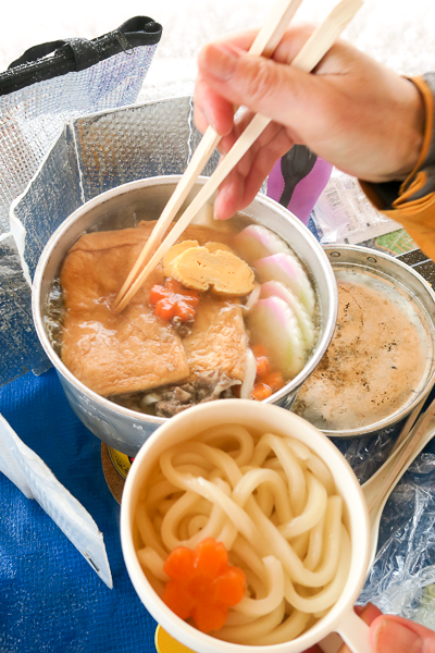 お肉に、揚げさん、人参、椎茸、出汁巻きに、カマボコ、えーっと、あと何だったっけ