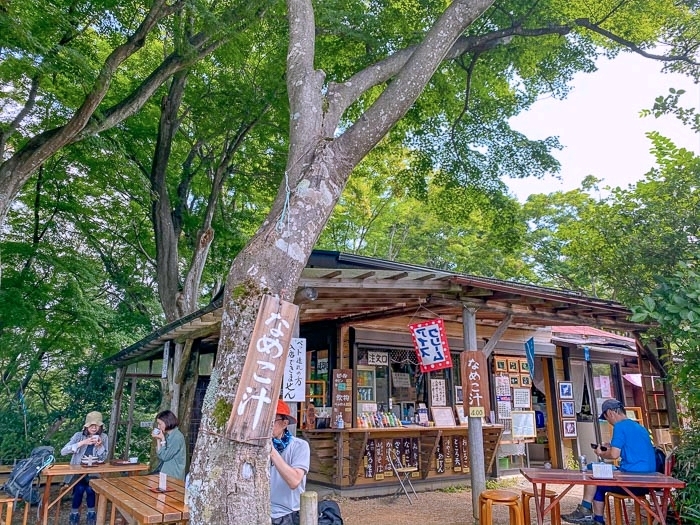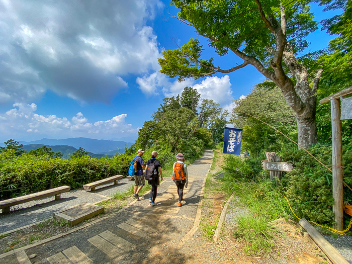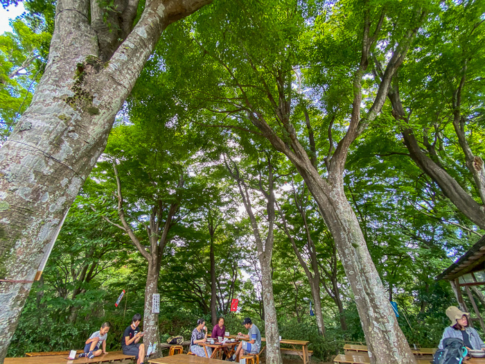 ブナの木陰でベンチに座り、道行くハイカーたちを眺めながら