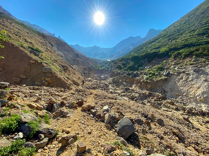 活火山である十勝岳を目の前に、溶岩で出来たトレイルを進む