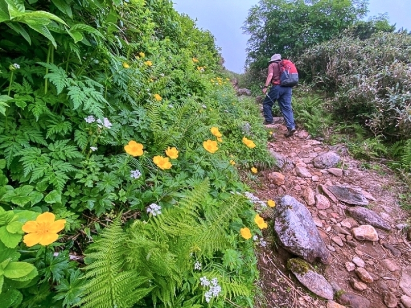 トレイルはチシマキンバイが両側に咲き、チングルマの群生も現れる