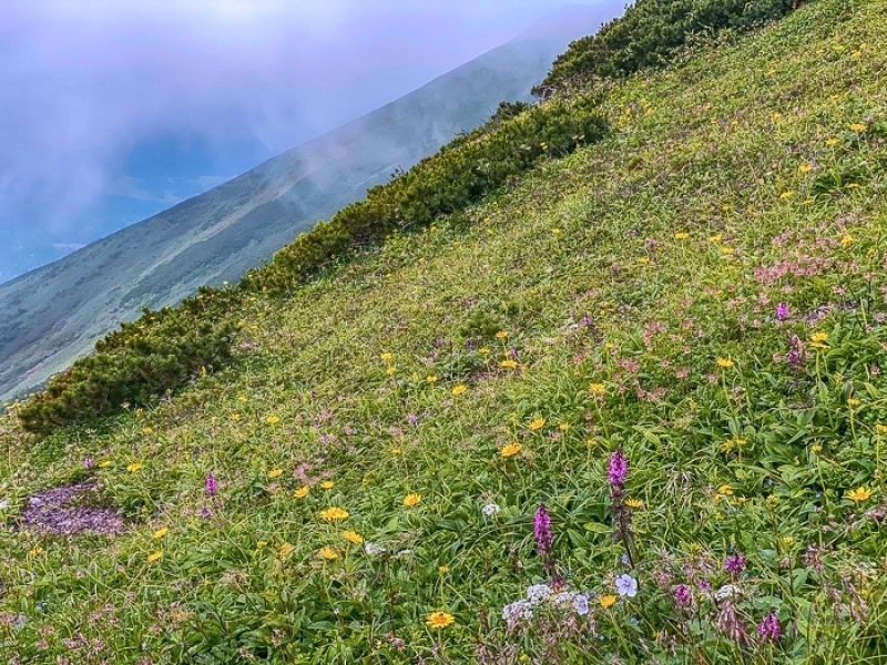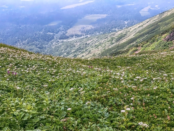 ガスに煙る花の山 富良野岳