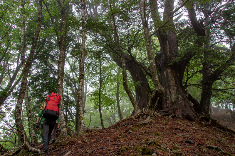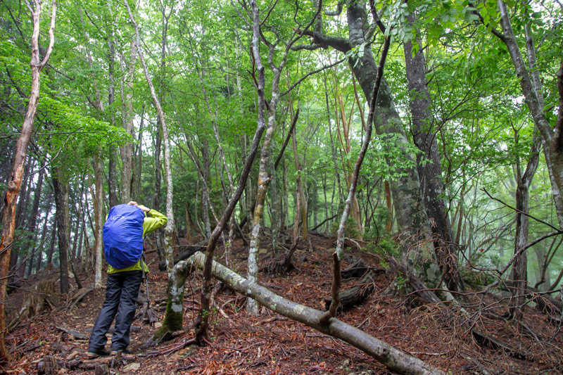 80Lほどある大きなザックの青年は、紀伊山地のブナ林特有の