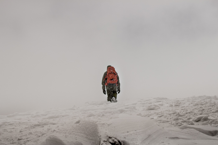 立っていられない風と雪に、思わずしゃがみこむ