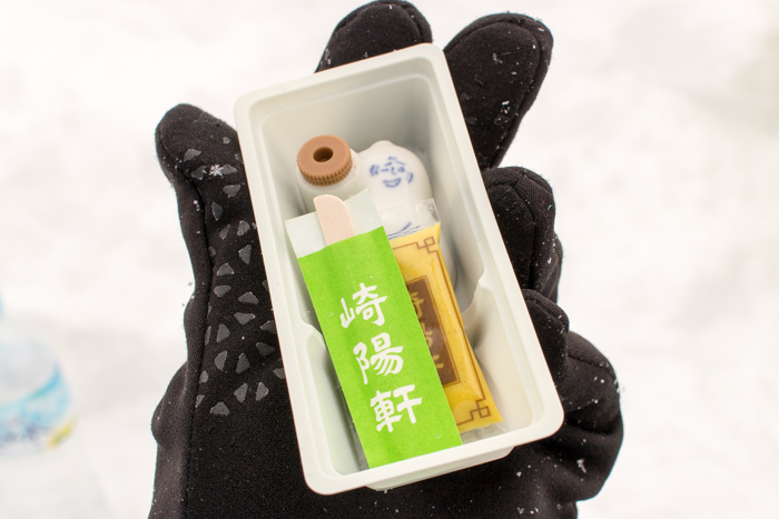 シューマイが雪の上に転がる