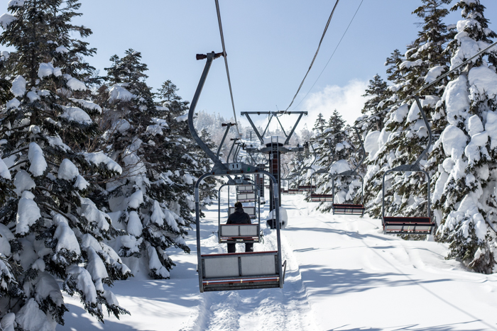 リフトの周りは背の高い針葉樹に囲まれ、別世界へと