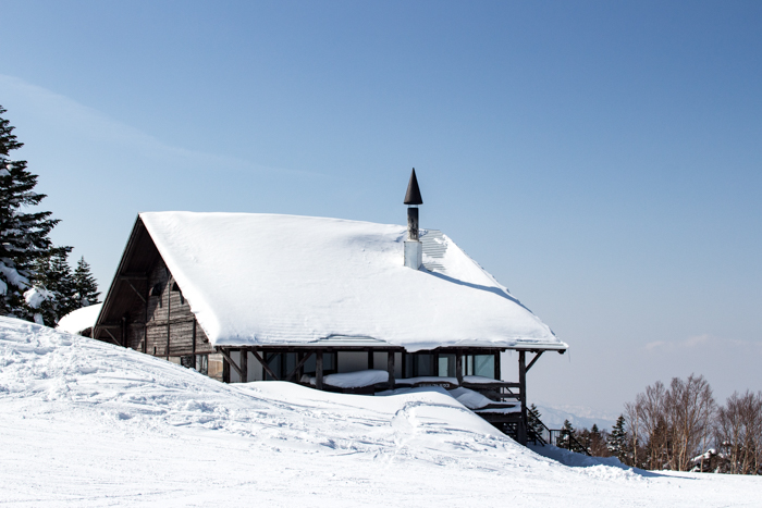 しゃくなげリフトを降りたところ、ロッジ風の小屋で休憩とする
