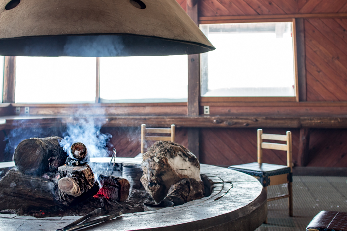 リフトの係員さんと思える方が小屋の暖炉にくべる薪の炎に暖まる