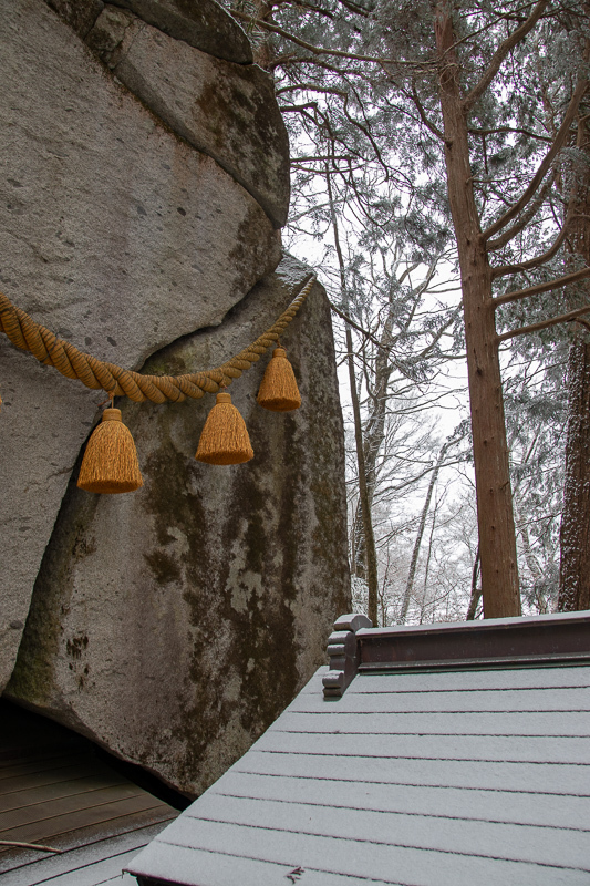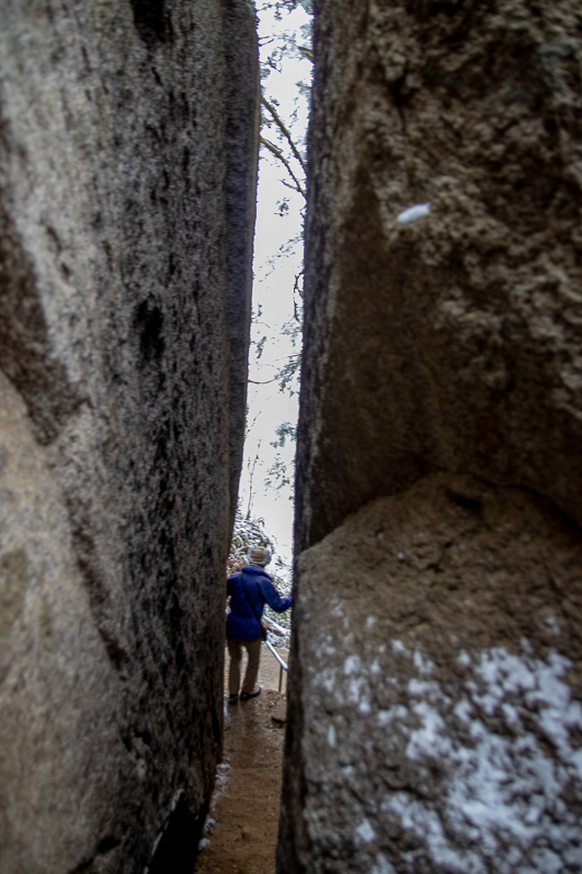 巨岩の大きな亀裂の中を、体を横にしてギリギリ通れる幅を