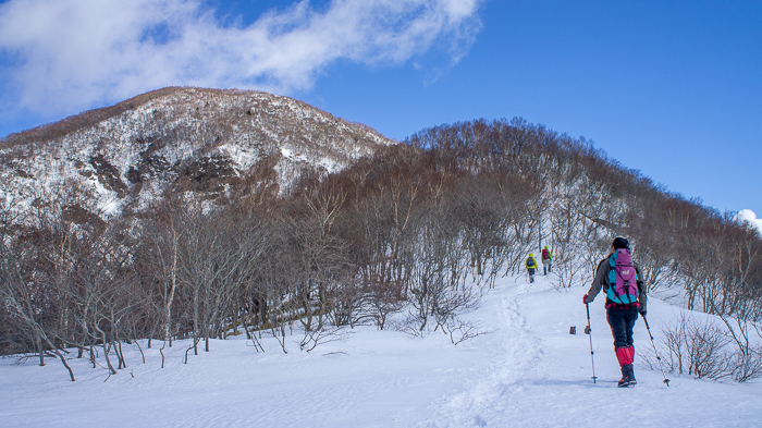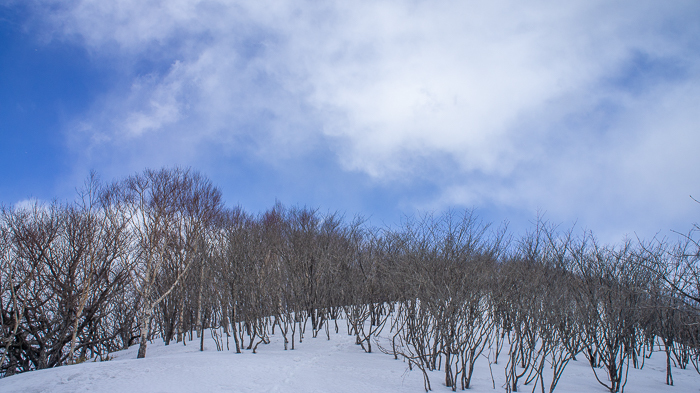 すぐに始まる九十九折れは緩やか、足元はギュッと締まった雪面だ