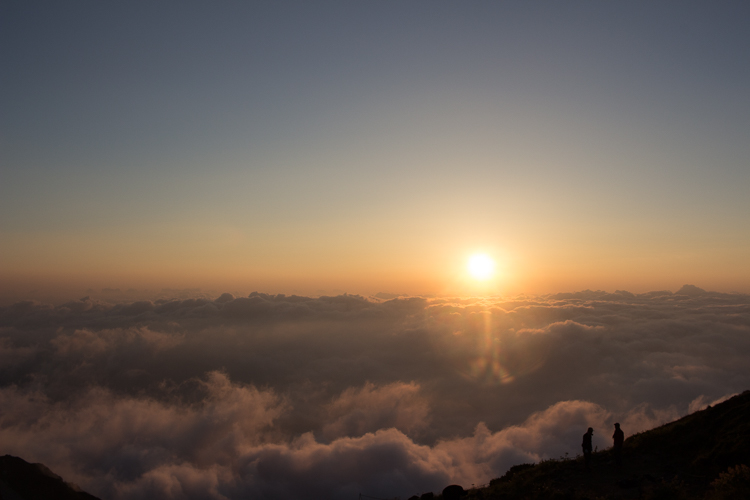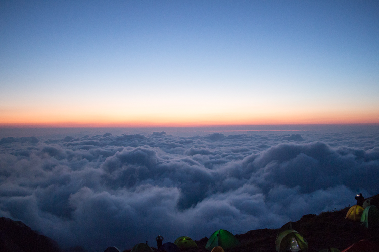 4時に起きると、テン場の向こうには茜色に染まる雲海