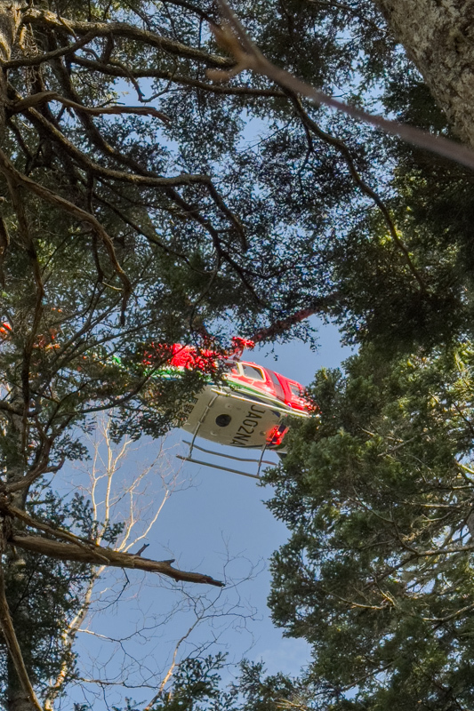 と、ホバリング状態から樹林の中を二人のレスキュー隊員がするする降りて来た