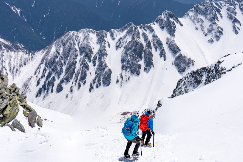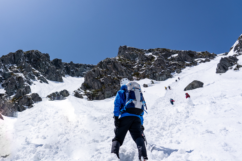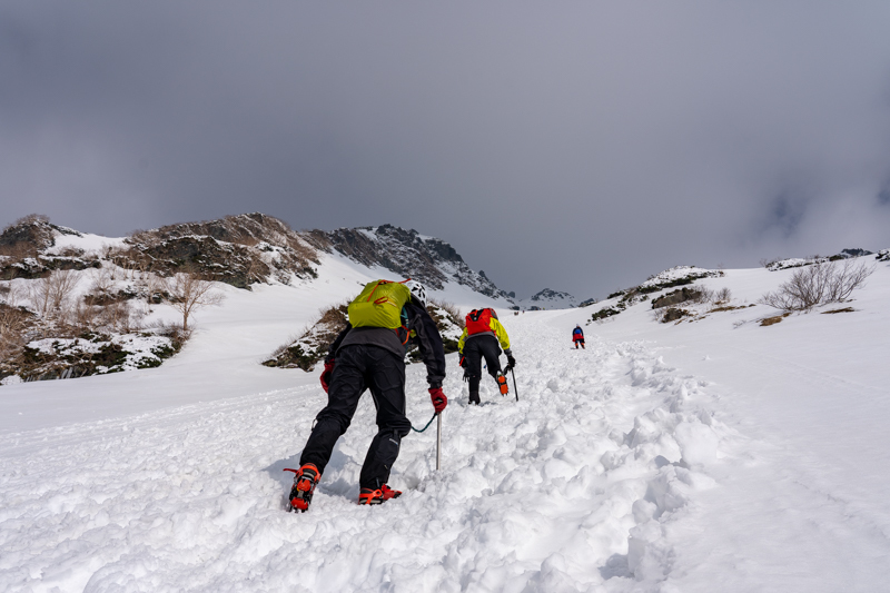 雪崩から逆横方向へトラバース、ピッケルを強く刺してビレイ