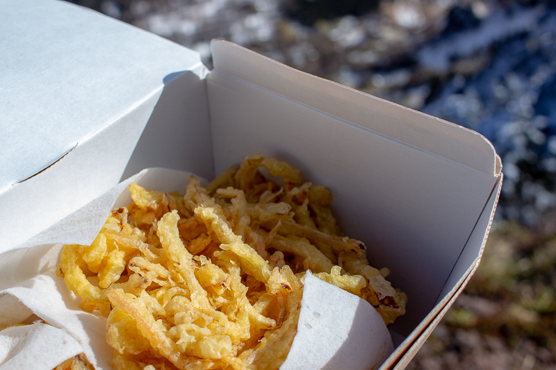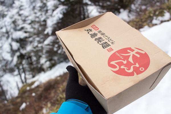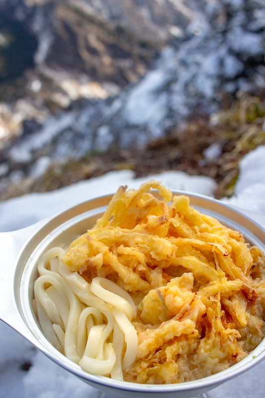 この「野菜かき揚」を、お山で、もちろん、冬の雪山で食べる!