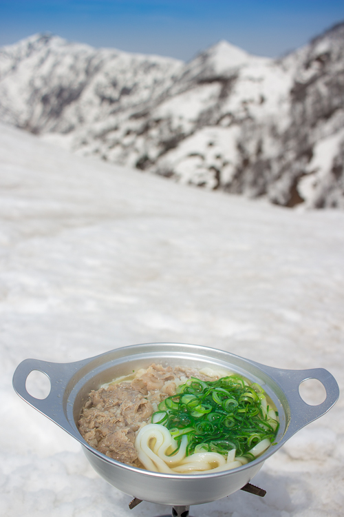 今日の山ごはん 残雪、稜線、肉うどん