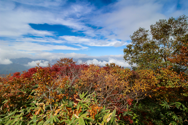笹の緑と真っ赤に色付いた木々が
