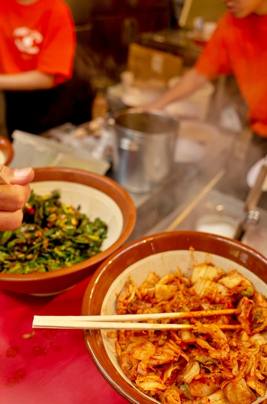 卓上に並ぶ暴力的な色合いのキムチ、ニラ