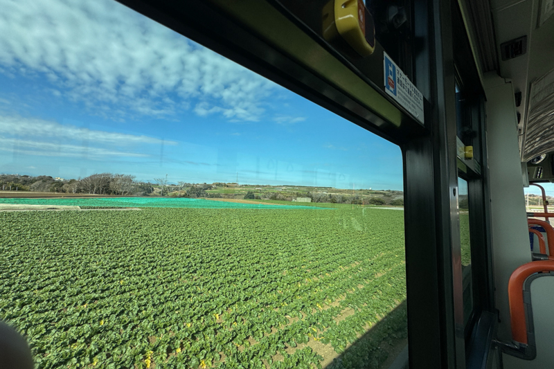窓から三浦大根の葉が一面に揺れる丘を眺めながら