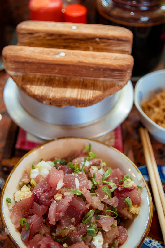 見事な包丁さばきでやっつけると、葱、生姜の薬味と共にたたく