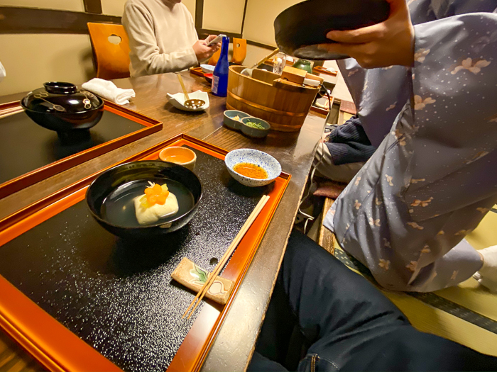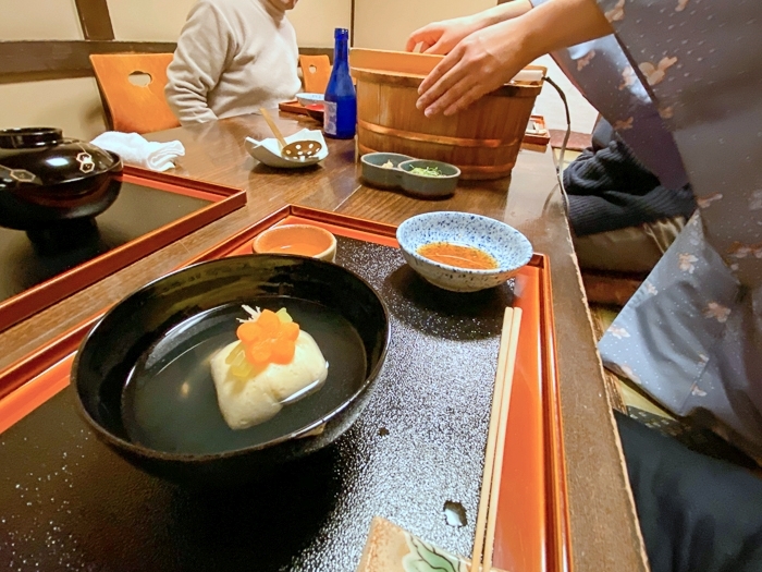 綺麗な着物姿のお姉さんに、よそって頂く湯豆腐