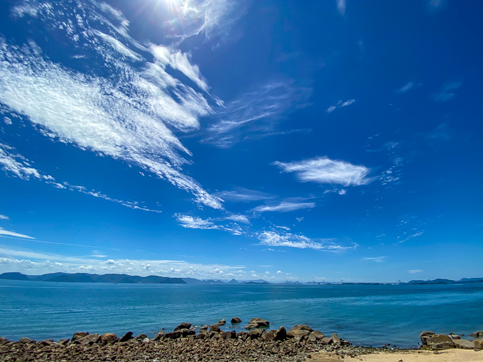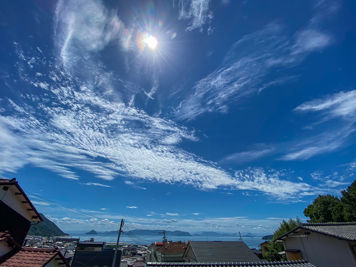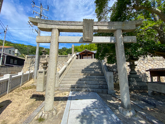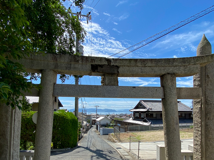 八幡さまをお参りして、鳥居の下から振り返ると瀬戸の静かな海
