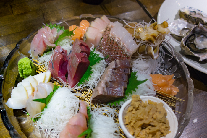 定番の、ウニ、イカ、マグロの乗った盛り合わせ
