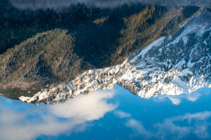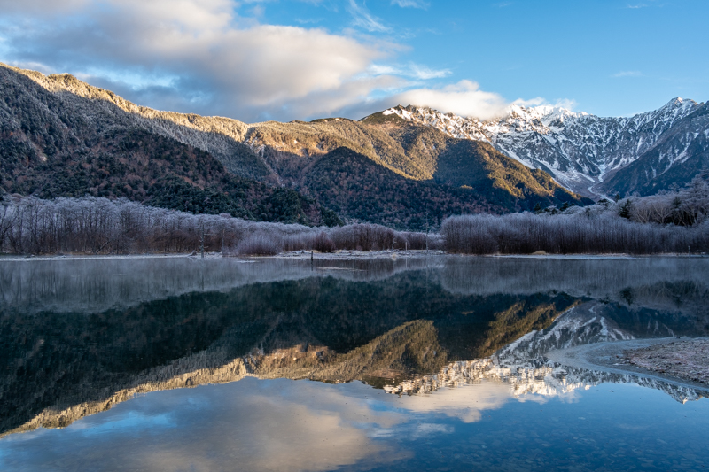 冠雪した穂高と焼岳、その稜線が写り込む湖面