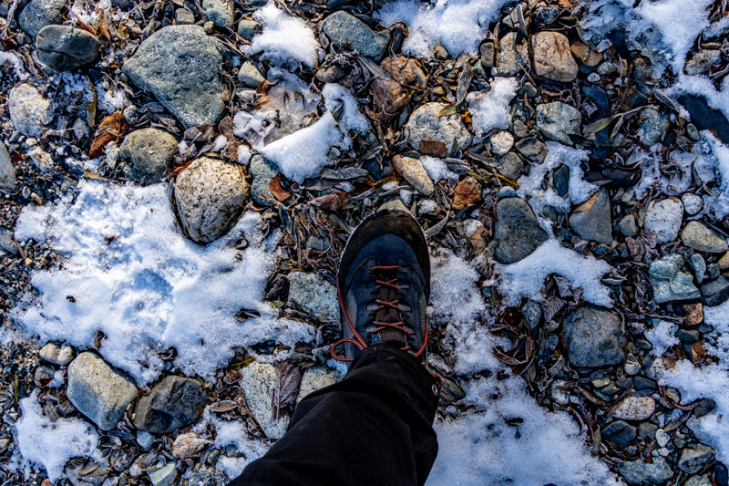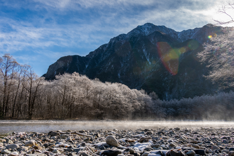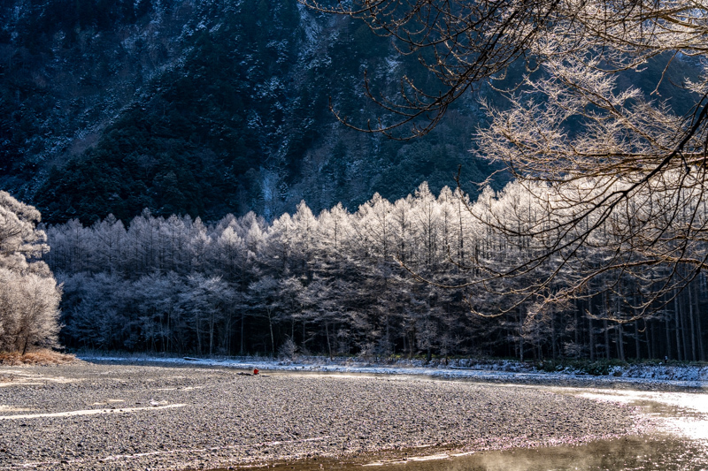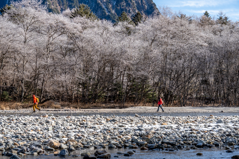 穂高橋の手前から河原に降りると、足元の砂利が凍っていた