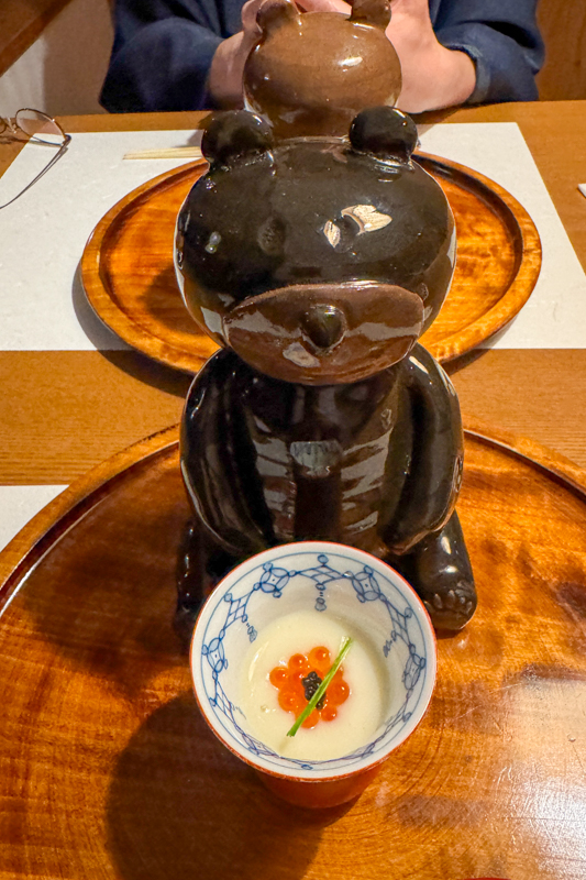 ダイニングは個室、一体一体の形が異なる熊にお迎えされて宴が始まり