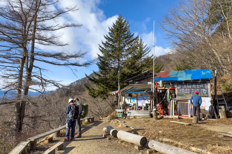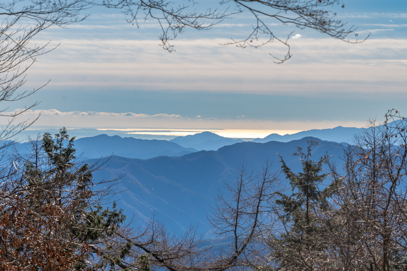 小屋のテン場からは隠れた富士の代わりに東京湾が鈍く光っているのが見える