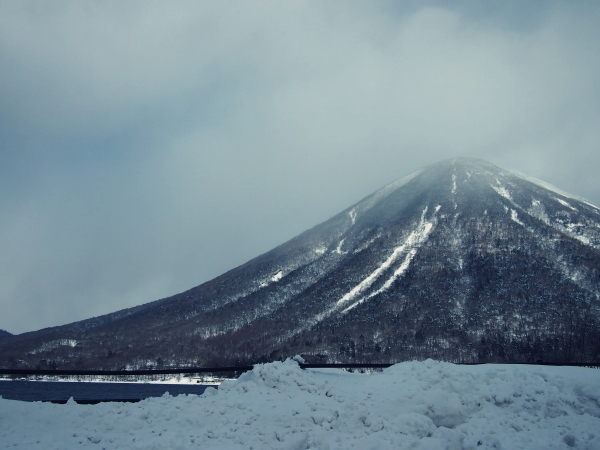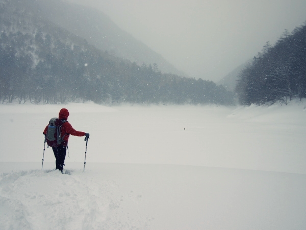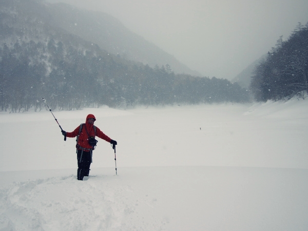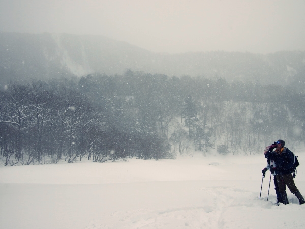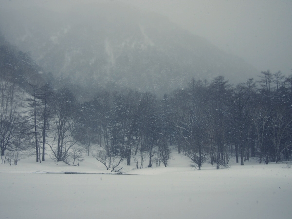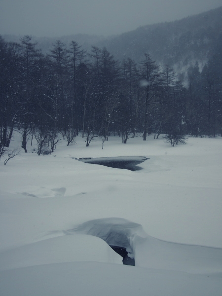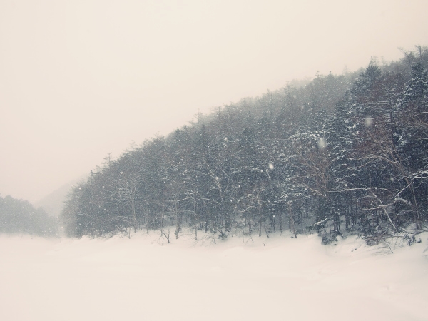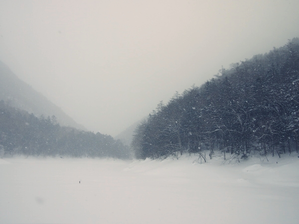 蓼ノ湖の凍る湖面に降り積もる雪、その向こうに広がる凍る森を見ていたら