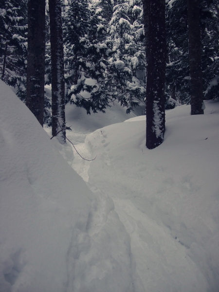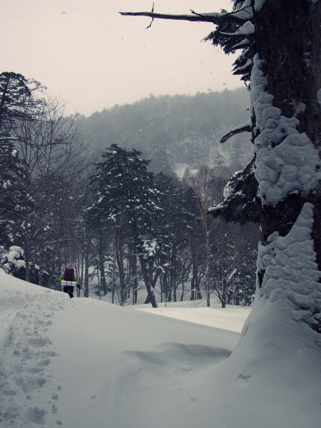 のろのろと小峠まで登りきると、その先は更に雪深い森の奥へと下る