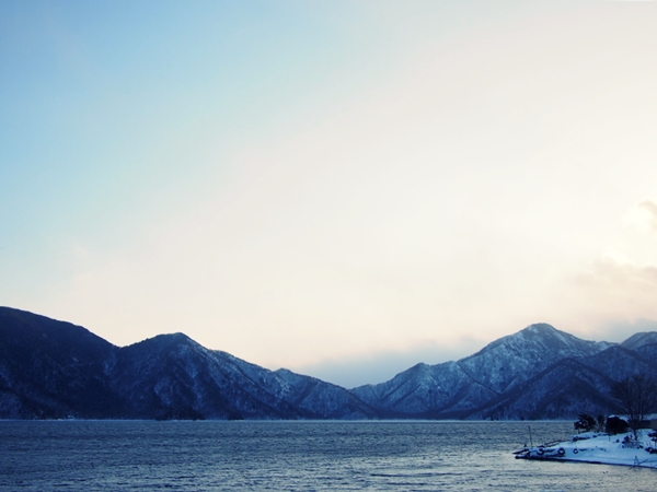 中禅寺湖はすっきりと晴れた空に薄らと赤く染まり始めていて