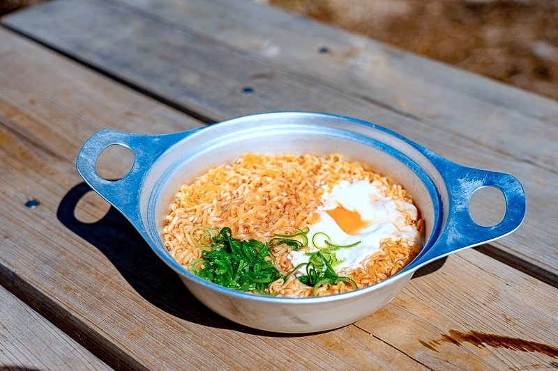 まだ冷たい風の中、小鍋で頂くチキンラーメンは