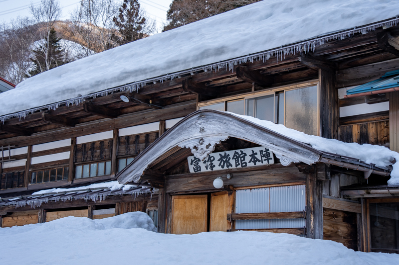 「宿場の湯」と風情ある名の温泉前に駐車すると、まだ雪に埋もれた集落の中を進む