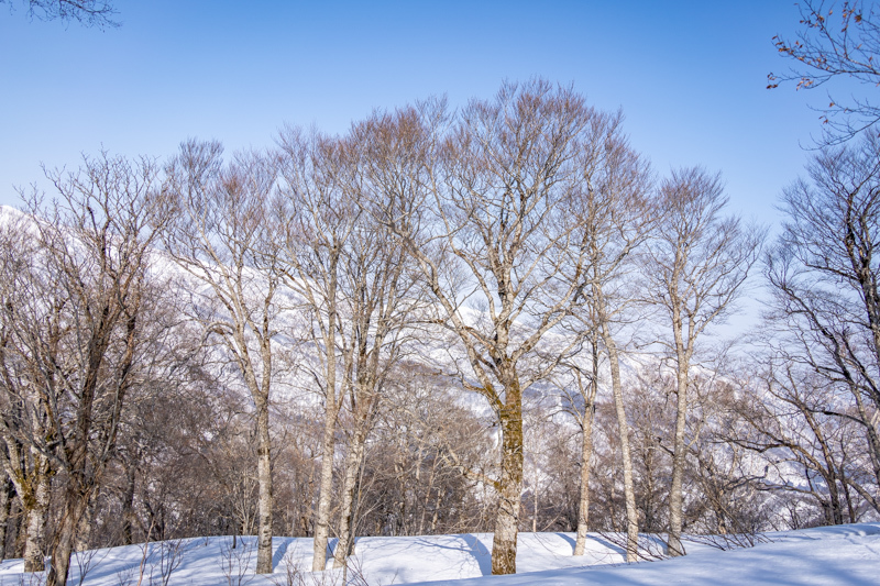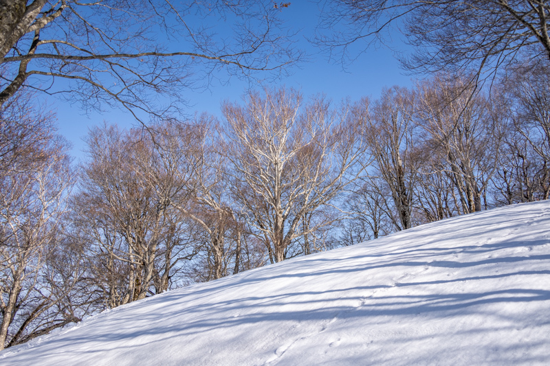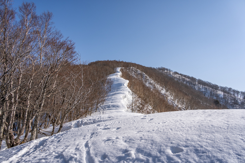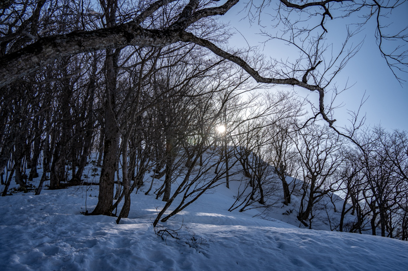 ブナの間、朝陽に照らされる残雪の上をわしわし進むと右手に稜線が近くなる