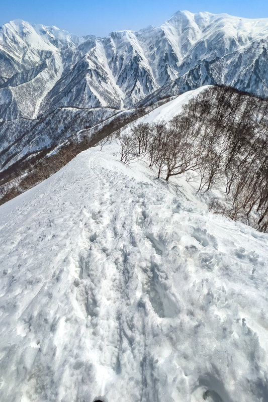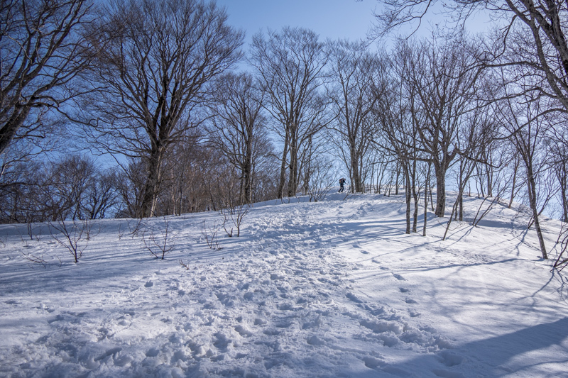 トレースにならって雪庇から離れて樹林沿いに進む