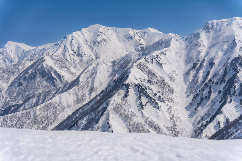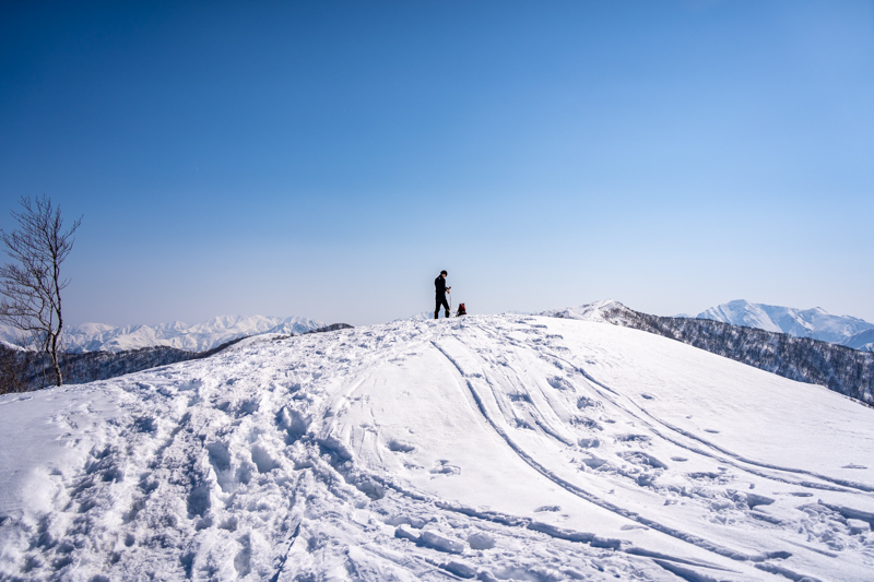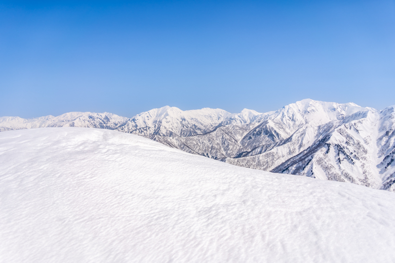 ふと振り返ると、背景にある苗場山のフラットな稜線