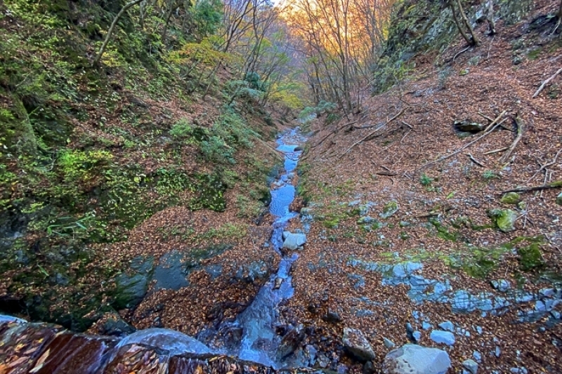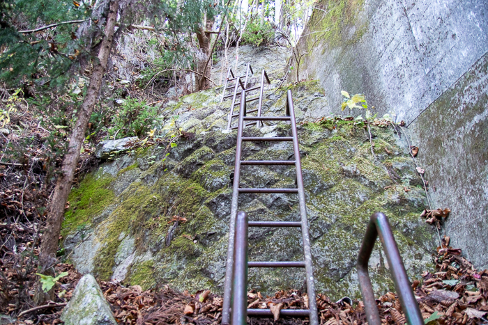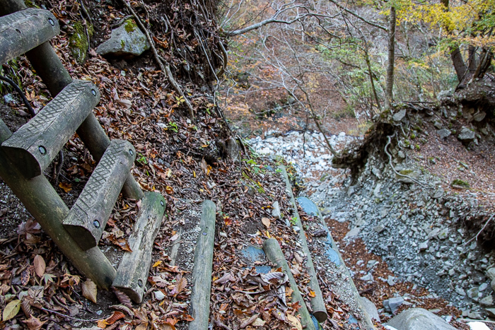 山から流れ込む小さな沢を巻くように、ハシゴやロープが数か所現れる