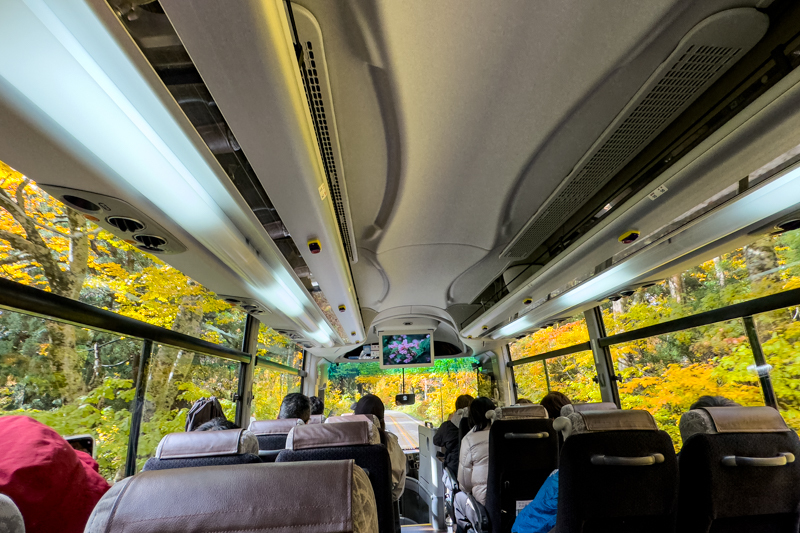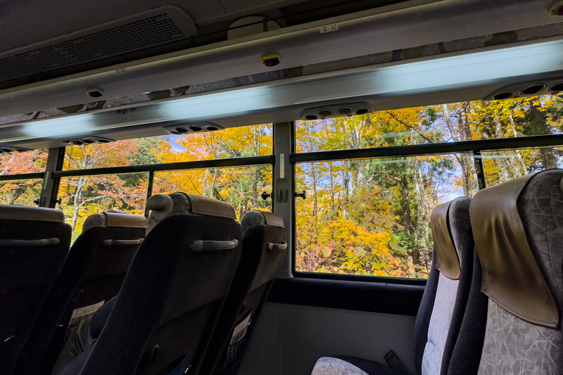 いつものカーブでバスが止まり、称名滝を窓越しに眺める