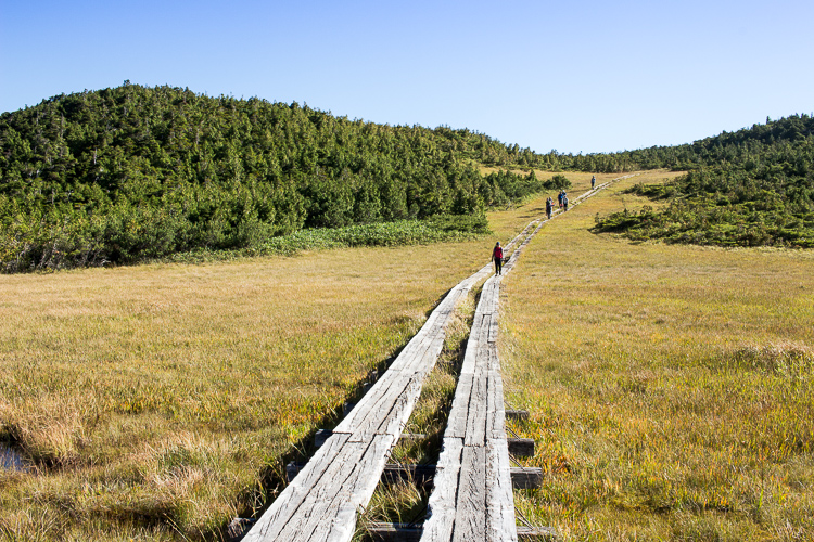 樹林の急登が30分続いたあと、視界が広がると、目の前に湿原がった
