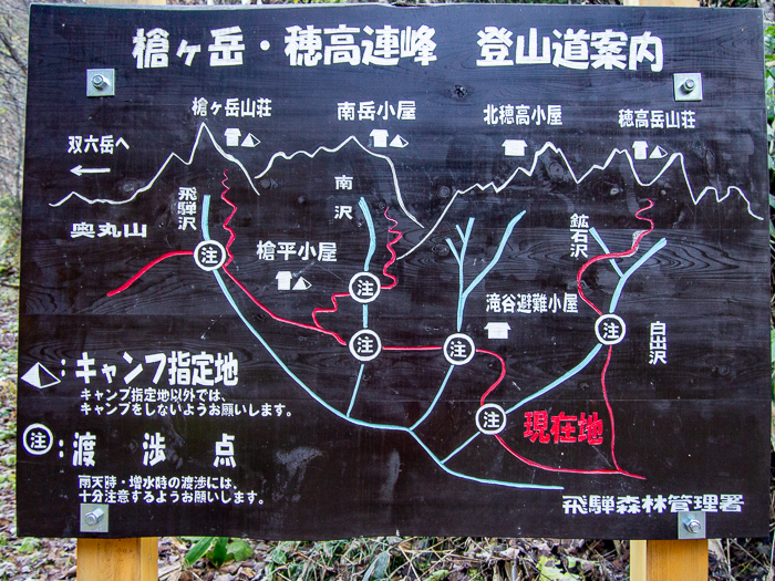 奥丸山(12:40-13:00)-槍平小屋(14:10-14:40)-滝谷(15:30)-白出沢(17:00)-新穂高(18:20)