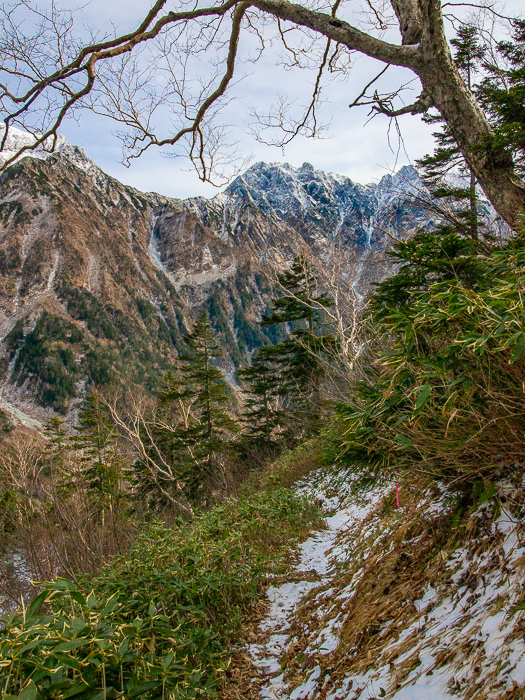 トレイルは薄らと雪が付き、時折り大きく崩れた崖際を回り込み、何度か危険を覚える