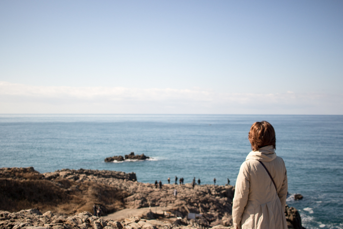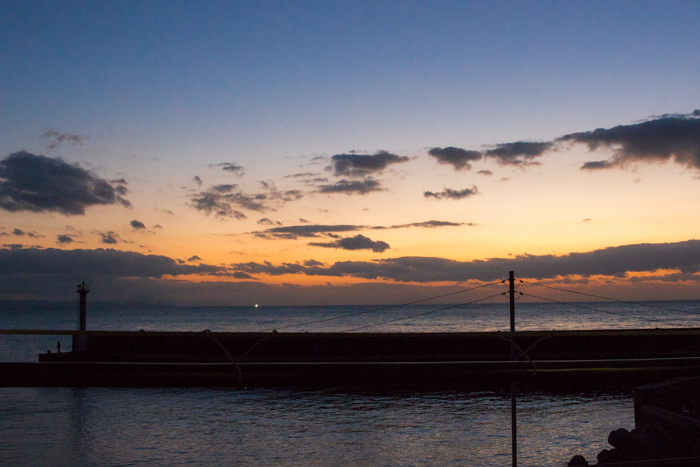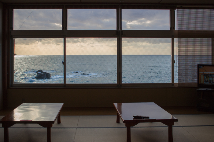 夕陽に染まり行く日本海の水平線を眺めながら浸かる湯